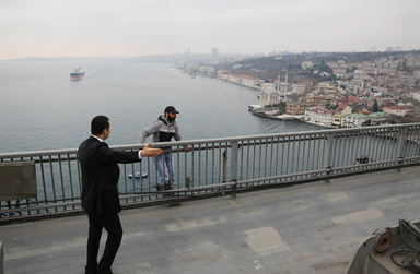 トルコ・イスタンブールのボスポラス橋の柵の後ろに立つ男性(右)に話し掛けるレジェプ・タイップ・エルドアン大統領の護衛(2015年12月25日撮影)。 【AFP】トルコのレジェプ・タイップ・エルドアン大統領が25日、同国イスタンブールのボスポラス橋から飛び降りようとしていた男性に対して弁舌を振るって説得し、自殺を思いとどまった男性と握手を交わす出来事があった。 男性は、金曜日の礼拝を終えたエルドア | ||||