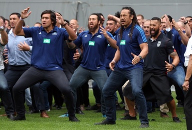 ハカを披露するタナ・ウマガ氏(右手前)ら元ラグビー選手たち(2015年11月30日撮影)。 【AFP】18日に亡くなったラグビー元ニュージーランド代表のジョナ・ロムー氏の追悼式典が30日、同国ラグビーの聖地イーデン・パークで催され、オールブラックスを披露した。 ロムー氏が収まった棺が霊柩車へ運ばれる際に、バック・シェルフォード氏をはじめとした20人以上のオールブラックスの元選手が「カマテ(Ka | ||||