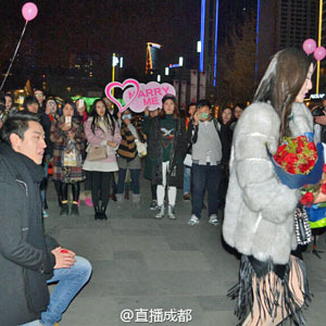 美談かヤラセか......公開プロポーズを拒否された中国人男性に、宝石店が"大きなダイヤの指輪"を贈呈 p> 中国四川省の省都・成都市の繁華街で12月17日の夜、公衆の面前で派手なプロポーズ劇が繰り広げられた。長身でハンサムな若い男性が、友人たちを引き連れ、若い女性の前で求愛のダンスを披露。その後、女性の前でひざまずき、指輪が入ったケースを捧げてプロポーズをしたのだ。/p> p> 思わぬ展開に、女性は感激の涙。ところが、ケースの中にあるダイヤモンドを見た瞬 | ||||