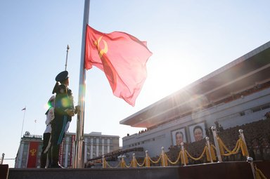 北朝鮮・平壌の金日成広場で、朝鮮労働党創建70周年を記念する大規模な軍事パレードの開始に際し、旗を掲げる兵士(2015年10月10日撮影、資料写真)。 【AFP】北朝鮮は8日、中東の2人の失脚した指導者の運命を引き合いに出し、水爆実験の正当性を主張した。また、水中でのミサイル発射実験の映像をテレビで放映し、軍事力を誇示した。 北朝鮮の朝鮮中央通信は8日夜の放送で、イラクの故サダム・フセイン元大統 | ||||