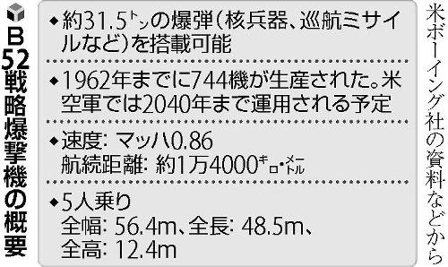 【ソウル=宮崎健雄、ワシントン=今井隆】米軍がB52戦略爆撃機を韓国上空で飛行させたのは、B52が北朝鮮が特に警戒感を持つ兵器の一つだからだ。韓国軍はF15戦闘機で飛行に加わり、米韓同盟の結束を誇示した。北朝鮮もけん制を続けており、神経戦が続いている。〈本文記事1面〉 B52が上空を飛行した在韓米軍の烏山(オサン)空軍基地で10日正午頃、イ・ワングン韓国空軍作戦司令官は「挑発には強力に報復する。米 | ||||