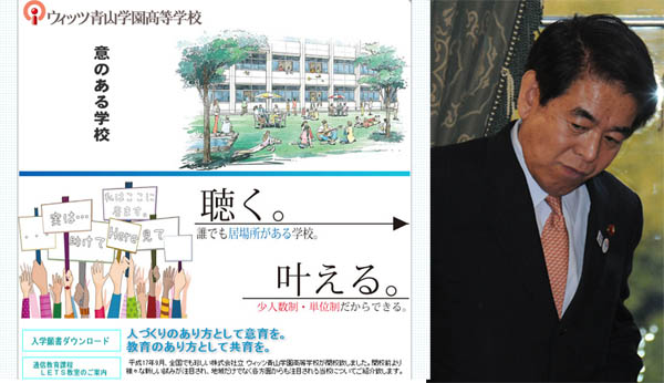 創設者とズブズブの仲の下村前文科相(左はウィッツ青山学園HP) 国の就学支援金を不正に受給していた疑いで家宅捜索を受けた「ウィッツ青山学園高校」(三重県伊賀市)が、トンデモ授業を行っていたことが発覚した。文科省が「過去に例がない極めて悪質なレベル」と表現するほどで、その内容は呆れ果てるものだ。具体的に列挙してみる。 ▼大阪市のテーマパーク「ユニバーサル・スタジオ・ジャパン(USJ)」での買い物のお | ||||
